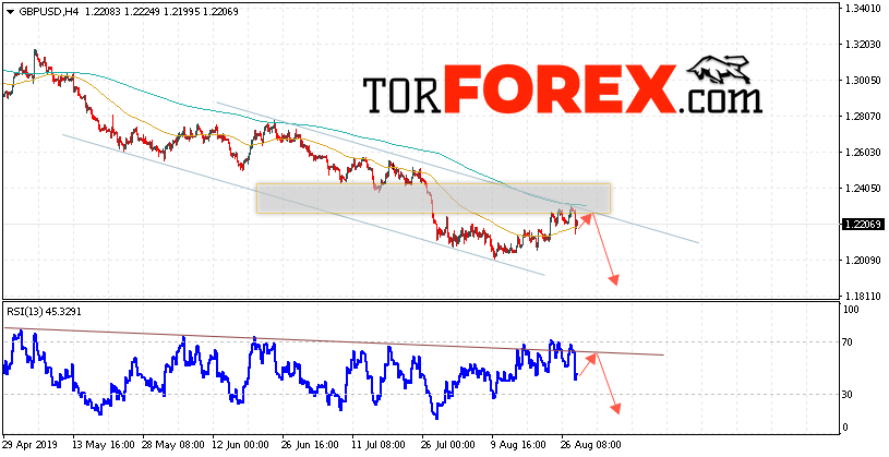 Валютная пара Фунт Доллар GBP/USD продолжает движение в рамках коррекции и нисходящего канала. Котировки показали отскок от верхней границы канала. В момент публикации прогноза курс Фунта к Доллару США на Форекс составляет 1.2206. Скользящие средние указывают на наличие краткосрочной медвежьей тенденции. На данный момент стоит ожидать попытку очередного роста курса и тест области сопротивления вблизи уровня 1.2305. Откуда вновь стоит ожидать отскок и продолжение падения Британского Фунта против Доллара США. Целью нисходящего движения валютной пары, в рамках Форекс прогноза на 29 августа 2019 года, выступает область на уровне 1.1825.