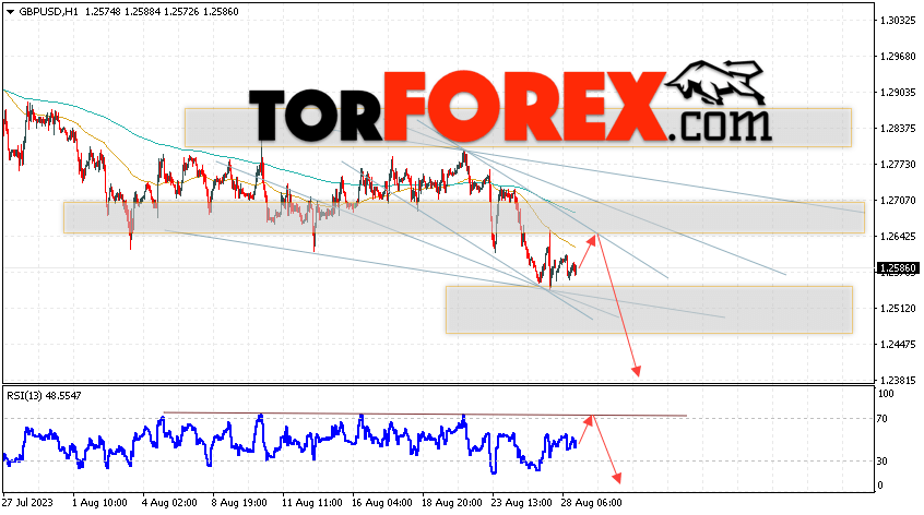 Валютная пара Фунт Доллар GBP/USD продолжает движение в рамках развития падения и нисходящего канала. В момент публикации прогноза курс Фунта к Доллару США на Форекс составляет 1.2586. Скользящие средние указывают на наличие краткосрочной бычьей тенденции. Цены пробили область между сигнальными линиями вверх, что указывает на давление со стороны продавцов валютной пары и потенциальное продолжение падения инструмента. На данный момент стоит ожидать попытку развития бычьей коррекции курса Британского Фунта против Американского Доллара и тест области сопротивления вблизи уровня 1.2635. Откуда вновь стоит ожидать отскок котировок пары вниз и продолжения падения валютной пары Британского Фунта против Доллара США. Целью снижения пары, в рамках Форекс прогноза на 29 августа 2023, выступает область на уровне 1.2385.
