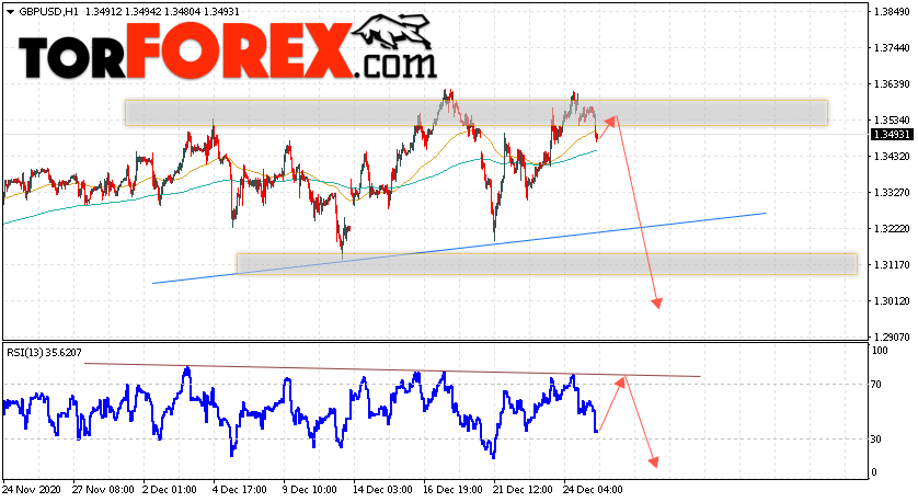 Валютная пара Фунт Доллар GBP/USD продолжает движение в рамках коррекции и формирования разворотной модели ”Голова и плечи”. В момент публикации прогноза курс Фунта к Доллару США на Форекс составляет 1.3493. Скользящие средние указывают на наличие краткосрочной бычьей тенденции. Цены вновь оттолкнулись от области между сигнальными линиями вверх, что указывает на давление со стороны покупателей валютной пары и потенциальное продолжение подъёма инструмента. На данный момент стоит ожидать попытку бычьей коррекции курса Британского Фунта против Американского Доллара и тест области сопротивления вблизи уровня 1.3535. Откуда вновь стоит ожидать отскок и начала падения котировок валютной пары Британского Фунта против Доллара США. Целью нисходящего движения валютной пары, в рамках Форекс прогноза на 29 декабря 2020, выступает область на уровне 1.3015.