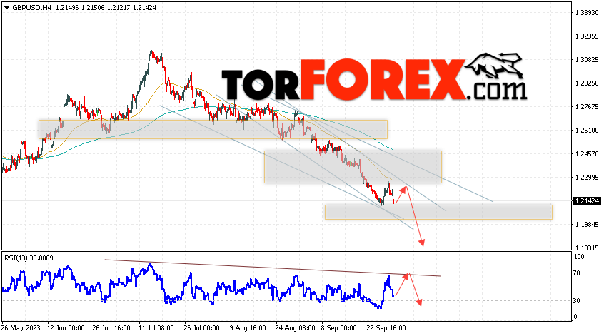 Валютная пара Фунт Доллар GBP/USD продолжает движение в рамках развития бычьей коррекции и медвежьего канала. В момент публикации прогноза курс Фунта к Доллару США на Форекс составляет 1.2215. Скользящие средние указывают на наличие краткосрочной медвежьей тенденции. Цены пробили область между сигнальными линиями, что указывает на давление со стороны продавцов валютной пары и потенциальное продолжение падения инструмента. На данный момент стоит ожидать попытку развития незначительной бычьей коррекции курса Британского Фунта против Американского Доллара и тест области сопротивления вблизи уровня 1.2275. Откуда вновь стоит ожидать отскок котировок пары вниз и продолжения падения валютной пары Британского Фунта против Доллара США. Целью снижения пары, в рамках Форекс прогноза на 3 октября 2023, выступает область на уровне 1.1825.