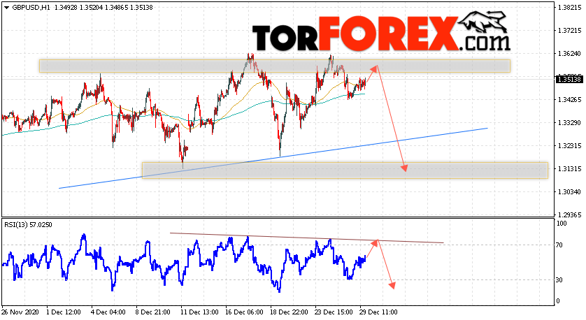 Валютная пара Фунт Доллар GBP/USD продолжает движение в рамках коррекции и формирования разворотной модели ”Голова и плечи”. В момент публикации прогноза курс Фунта к Доллару США на Форекс составляет 1.3513. Скользящие средние указывают на наличие краткосрочной бычьей тенденции. Цены вновь отталкиваются от области между сигнальными линиями, что указывает на давление со стороны покупателей валютной пары и потенциальное продолжение подъёма инструмента. На данный момент стоит ожидать попытку бычьей коррекции курса Британского Фунта против Американского Доллара и тест области сопротивления вблизи уровня 1.3545. Откуда вновь стоит ожидать отскок и начала падения котировок валютной пары Британского Фунта против Доллара США. Целью нисходящего движения валютной пары, в рамках Форекс прогноза на 30 декабря 2020, выступает область на уровне 1.3135.