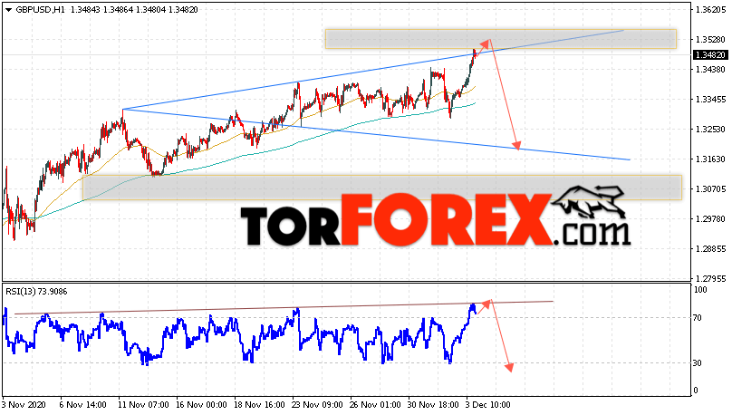 Валютная пара Фунт Доллар GBP/USD продолжает движение в рамках сильного роста и формирования медвежьей модели ”Волна Вульфа”. В момент публикации прогноза курс Фунта к Доллару США на Форекс составляет 1.3482. Скользящие средние указывают на наличие краткосрочной бычьей тенденции. Цены ушли вверх от области между сигнальными линиями вверх, что указывает на давление со стороны покупателей валютной пары и потенциальное продолжение роста инструмента. На данный момент стоит ожидать попытку бычьей коррекции курса Британского Фунта против Американского Доллара и тест области сопротивления вблизи уровня 1.3525. Откуда вновь стоит ожидать отскок и начала падения котировок валютной пары Британского Фунта против Доллара США. Целью нисходящего движения валютной пары, в рамках Форекс прогноза на 4 декабря 2020, выступает область на уровне 1.3205.