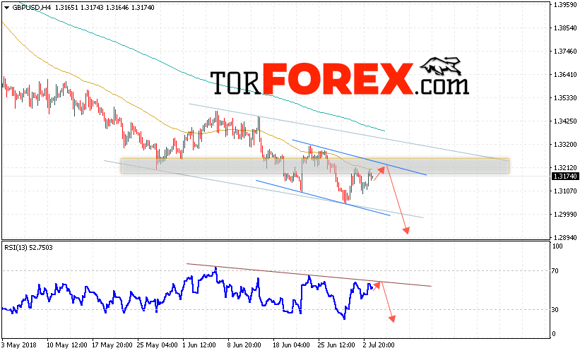 Таким образом, GBP/USD прогноз Фунт Доллар на 4 июля 2018 предполагает попытку теста области сопротивления вблизи уровня 1.3210 и продолжение падения с целью ниже уровня 1.2895, дополнительным сигналом в пользу падения Британского Фунта выступит тест линии сопротивления на индикаторе относительной силы, отменой варианта падения станет сильный рост и пробой области 1.3240, что укажет на выход котировок за пределы канала.