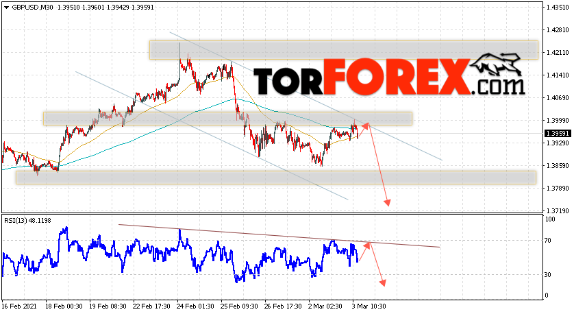 Валютная пара Фунт Доллар GBP/USD продолжает движение в рамках коррекции и нисходящего канала. В момент публикации прогноза курс Фунта к Доллару США на Форекс составляет 1.3959. Скользящие средние указывают на наличие краткосрочной медвежьей тенденции. Цены вновь тестируют область между сигнальными линиями, что указывает на давление со стороны продавцов валютной пары и потенциальное продолжение падения инструмента. На данный момент стоит ожидать попытку бычьей коррекции курса Британского Фунта против Американского Доллара и тест области сопротивления вблизи уровня 1.3975. Откуда вновь стоит ожидать отскок и продолжения падения котировок валютной пары Британского Фунта против Доллара США. Целью нисходящего движения валютной пары, в рамках Форекс прогноза на 4 марта 2021, выступает область на уровне 1.3725.
