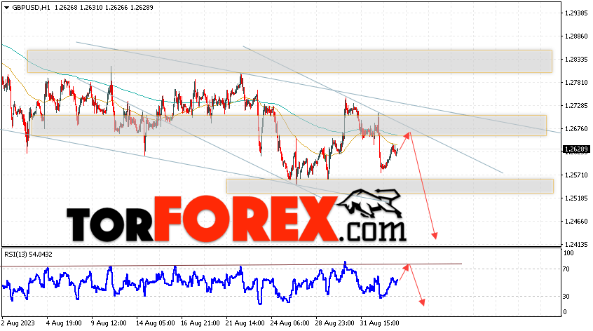Валютная пара Фунт Доллар GBP/USD продолжает движение в рамках развития бычьей коррекции и нисходящего канала. В момент публикации прогноза курс Фунта к Доллару США на Форекс составляет 1.2628. Скользящие средние указывают на наличие краткосрочной медвежьей тенденции. Цены вновь тестируют область между сигнальными линиями, что указывает на давление со стороны продавцов валютной пары и потенциальное продолжение падения инструмента. На данный момент стоит ожидать попытку развития незначительной бычьей коррекции курса Британского Фунта против Американского Доллара и тест области сопротивления вблизи уровня 1.2665. Откуда вновь стоит ожидать отскок котировок пары вниз и продолжения падения валютной пары Британского Фунта против Доллара США. Целью снижения пары, в рамках Форекс прогноза на 5 сентября 2023, выступает область на уровне 1.2415.