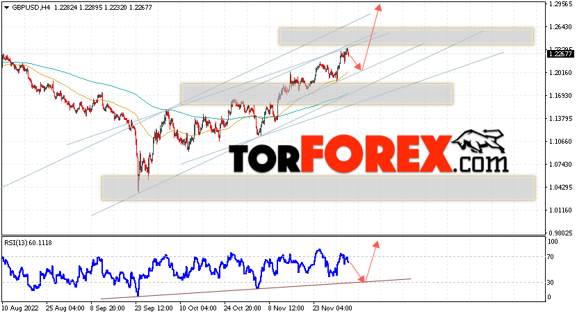 Валютная пара Фунт Доллар GBP/USD продолжает движение в рамках развития коррекции и бычьего канала. В момент публикации прогноза курс Фунта к Доллару США на Форекс составляет 1.2267. Скользящие средние указывают на наличие краткосрочной бычьей тенденции. Цены пробили область между сигнальными линиями вверх, что указывает на давление со стороны покупателей валютной пары и потенциальное продолжение роста инструмента. На данный момент стоит ожидать попытку развития коррекции цены курса Британского Фунта против Американского Доллара и тест области поддержки вблизи уровня 1.2035. Откуда вновь стоит ожидать отскок вверх и продолжения роста котировок валютной пары Британского Фунта против Доллара США. Целью подъёма пары, в рамках Форекс прогноза на 6 декабря 2022, выступает область на уровне 1.2965.