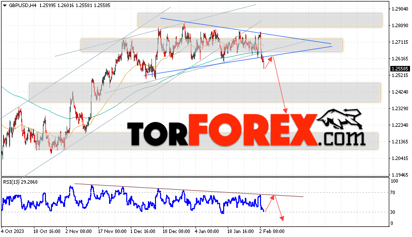 Валютная пара Фунт Доллар GBP/USD продолжает движение в рамках развития падения и начала отработки модели «Треугольник». В момент публикации прогноза курс Фунта к Доллару США на Форекс составляет 1.2558. Скользящие средние указывают на наличие краткосрочной медвежьей тенденции. Цены пробили область между сигнальными линиями вниз, что указывает на давление со стороны продавцов валютной пары и потенциальное продолжение падения инструмента. На данный момент стоит ожидать попытку развития роста курса Британского Фунта против Американского Доллара и тест области сопротивления вблизи уровня 1.2615. Откуда вновь стоит ожидать отскок котировок пары вниз и продолжения падения валютной пары Британского Фунта против Доллара США. Целью снижения пары, в рамках Форекс прогноза, выступает область на уровне 1.2325.