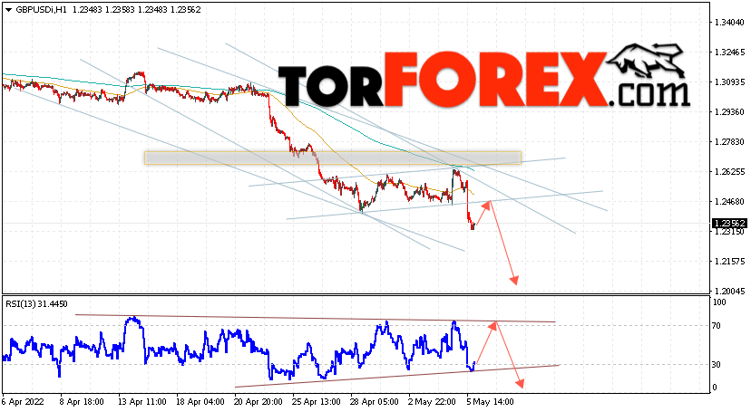 Валютная пара Фунт Доллар GBP/USD продолжает движение в рамках падения и нисходящего канала. В момент публикации прогноза курс Фунта к Доллару США на Форекс составляет 1.2356. Скользящие средние указывают на наличие краткосрочной медвежьей тенденции. Цены пробили область между сигнальными линиями, что указывает на давление со стороны продавцов валютной пары и потенциальное продолжение падения инструмента. На данный момент стоит ожидать попытку развития небольшой коррекции цены курса Британского Фунта против Американского Доллара и тест области сопротивления вблизи уровня 1.2465. Откуда вновь стоит ожидать отскок вниз и продолжения падения котировок валютной пары Британского Фунта против Доллара США. Целью снижения пары, в рамках Форекс прогноза на 6 мая 2022, выступает область на уровне 1.2005.