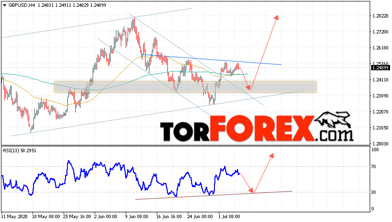 Валютная пара Фунт Доллар GBP/USD продолжает движение в рамках коррекции и формирования разворотной модели «Голова и плечи». В момент публикации прогноза курс Фунта к Доллару США на Форекс составляет 1.2489. Скользящие средние указывают на наличие краткосрочной боковой тенденции. Цены пробили область между сигнальными линиями вверх, что указывает на давление со стороны покупателей валютной пары. На данный момент стоит ожидать попытку развития снижения курса Британского Фунта против Американского Доллара и тест области поддержки вблизи уровня 1.2350. Откуда вновь стоит ожидать отскок и продолжения роста котировок валютной пары Британского Фунта против Доллара США. Целью восходящего движения валютной пары, в рамках Форекс прогноза на 7 июля 2020 года, выступает область на уровне 1.2825.