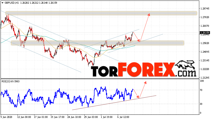 Валютная пара Фунт Доллар GBP/USD продолжает движение в рамках роста. В момент публикации прогноза курс Фунта к Доллару США на Форекс составляет 1.2615. Скользящие средние указывают на наличие краткосрочной бычьей тенденции. Цены ушли вверх от области между сигнальными линиями, что указывает на давление со стороны покупателей валютной пары. На данный момент стоит ожидать попытку развития снижения курса Британского Фунта против Американского Доллара и тест области поддержки вблизи уровня 1.2510. Откуда вновь стоит ожидать отскок и продолжения роста котировок валютной пары Британского Фунта против Доллара США. Целью восходящего движения валютной пары, в рамках Форекс прогноза на 9 июля 2020 года, выступает область на уровне 1.2795.