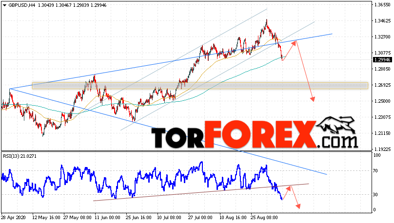 Валютная пара Фунт Доллар GBP/USD продолжает движение в рамках коррекции и формирования разворотной модели ”Волны Вульфа”. В момент публикации прогноза курс Фунта к Доллару США на Форекс составляет 1.2994. Скользящие средние указывают на наличие краткосрочной бычьей тенденции. Цены пробили область между сигнальными линиями вниз, что указывает на давление со стороны продавцов валютной пары и потенциальное продолжение падения актива. На данный момент стоит ожидать попытку коррекции курса Британского Фунта против Американского Доллара и тест области сопротивления вблизи уровня 1.3155. Откуда вновь стоит ожидать отскок и начало падения котировок валютной пары Британского Фунта против Доллара США. Целью нисходящего движения валютной пары, в рамках Форекс прогноза на 9 сентября 2020, выступает область на уровне 1.2495.