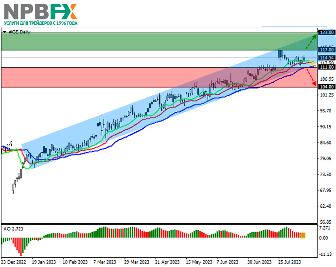 Акции General Electric Co., американской многоотраслевой корпорации, усиливают коррекцию, торгуясь на уровне 114.00.