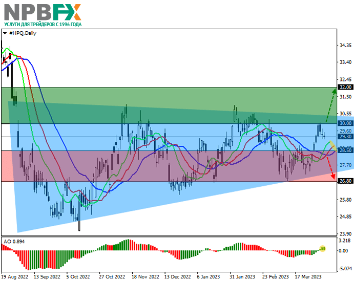 Акции Hewlett-Packard Co., американского гиганта в области информационных технологий, торгуются в коррекционном тренде на уровне 29.30.