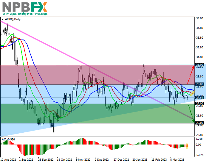 Акции Hewlett-Packard Co., американского гиганта в области информационных технологий, движутся в коррекционном тренде на отметке 27.60.