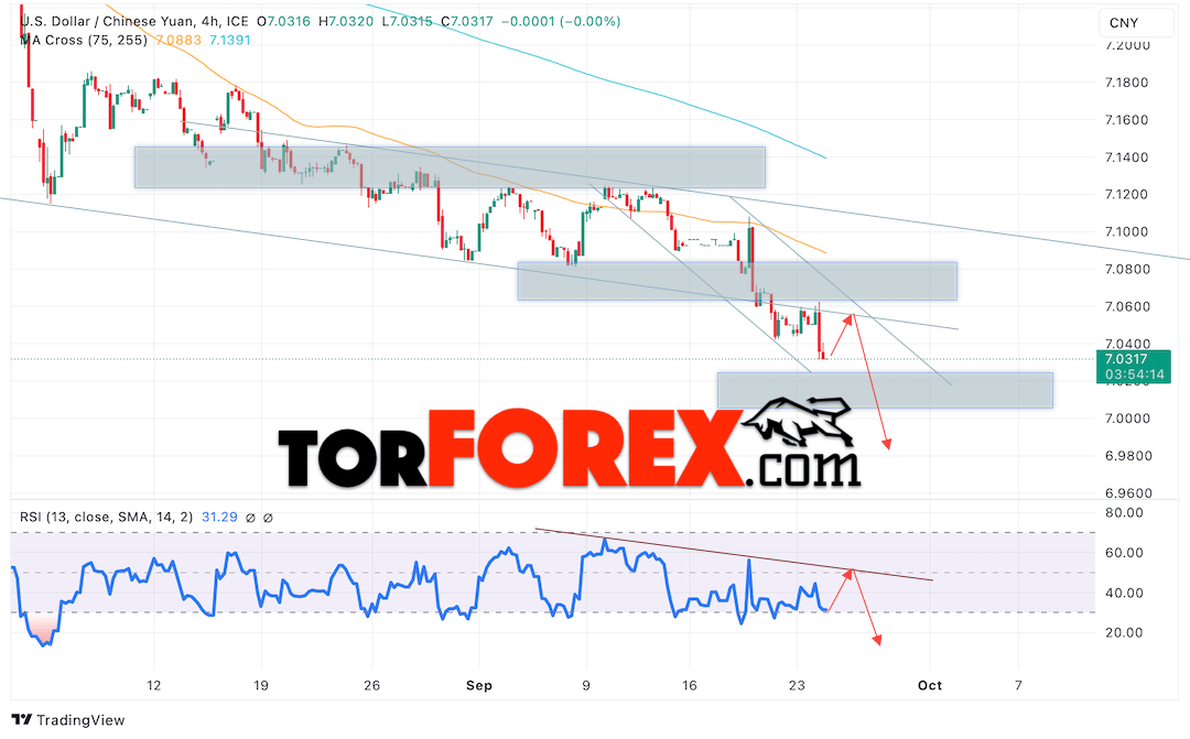 Дополнительным сигналом в пользу подъёма валютной пары USD/CNY 25 сентября 2024 выступит тест линии тренда на индикаторе относительной силы (RSI). Вторым сигналом станет отток от нижней границы медвежьего канала. Отменой варианта снижения пары USD/CNY на Форекс станет сильный рост котировок и пробой уровня 7.07 Юаней за Доллар. Это укажет на пробой области сопротивления и продолжение роста пары Доллар Китайский Юань в область выше уровня 7.13. Подтверждением падению пары выступит пробой области поддержки и закрытие котировок актива над уровнем 7.02.