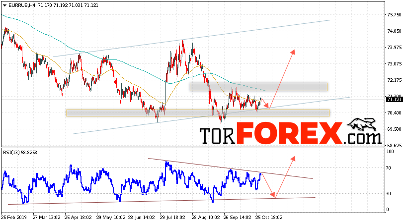 Дополнительным сигнальном в пользу роста валютной пары EUR/RUB на Форекс выступит тест восходящей линии тренда на индикаторе относительной силы. Вторым сигналом в пользу роста курса станет отскок от нижней границы модели «Двойное Дно». Отменой варианта роста пары EUR/RUB на Форекс 1 ноября 2019 станет падение и пробой уровня 69.55 Евро за Рубль. Это укажет на пробой области поддержки и продолжение падения пары Евро Рубль в область ниже уровня 67.05. Подтверждением роста валютной пары выступит пробой области сопротивления и закрытие котировок инструмента над уровнем 72.05, что укажет на завершение формирования разворотной модели «Двойное Дно».