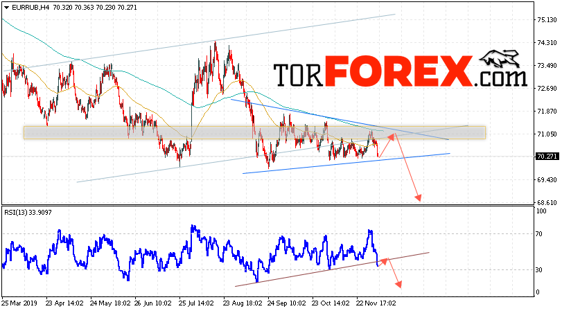 Дополнительным сигнальном в пользу снижения валютной пары EUR/RUB на Форекс выступит тест нисходящей линии тренда на индикаторе относительной силы. Вторым сигналом в пользу падения курса европейской валюты станет отскок от верхней границы модели «Треугольник». Отменой варианта падения валютной пары EUR/RUB на Форекс 10 декабря 2019 станет сильный рост и пробой уровня 72.05 Евро за Рубль. Это укажет на пробой области сопротивления и продолжение роста пары Евро Рубль в область выше уровня 74.45. Подтверждением падения валютной пары выступит пробой нижней границы модели «Треугольник» и закрытие котировок инструмента под уровнем 69.65.