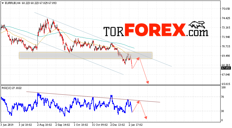 Дополнительным сигнальном в пользу снижения валютной пары EUR/RUB на Форекс выступит тест нисходящей линии тренда на индикаторе относительной силы. Вторым сигналом в пользу падения курса европейской валюты станет отскок от верхней границы нисходящего канала. Отменой варианта падения валютной пары EUR/RUB на Форекс 10 января 2020 станет сильный рост и пробой уровня 70.75 Евро за Рубль. Это укажет на пробой области сопротивления и продолжение роста пары Евро Рубль в область выше уровня 73.35. Подтверждением падения валютной пары выступит пробой области поддержки и закрытие котировок инструмента под уровнем 67.05.