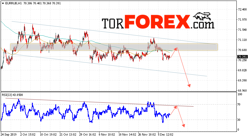 Дополнительным сигнальном в пользу снижения валютной пары EUR/RUB на Форекс выступит тест нисходящей линии тренда на индикаторе относительной силы. Вторым сигналом в пользу падения курса европейской валюты станет отскок от верхней границы нисходящего канала. Отменой варианта падения валютной пары EUR/RUB на Форекс 12 декабря 2019 станет сильный рост и пробой уровня 71.65 Евро за Рубль. Это укажет на пробой области сопротивления и продолжение роста пары Евро Рубль в область выше уровня 74.05. Подтверждением падения валютной пары выступит пробой области поддержки и закрытие котировок инструмента под уровнем 69.95.