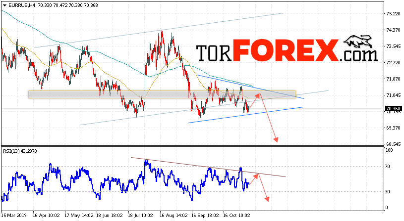 Дополнительным сигнальном в пользу падения валютной пары EUR/RUB на Форекс выступит тест нисходящей линии тренда на индикаторе относительной силы. Вторым сигналом в пользу падения курса станет отскок от верхней границы модели «Треугольник». Отменой варианта падения пары EUR/RUB на Форекс 12 ноября 2019 станет сильный рост и пробой уровня 72.05 Евро за Рубль. Это укажет на пробой области сопротивления и продолжение роста пары Евро Рубль в область выше уровня 75.05. Подтверждением падения валютной пары выступит пробой области поддержки и закрытие котировок инструмента под уровнем 69.45, что укажет на выход котировок за пределы модели «Треугольник».