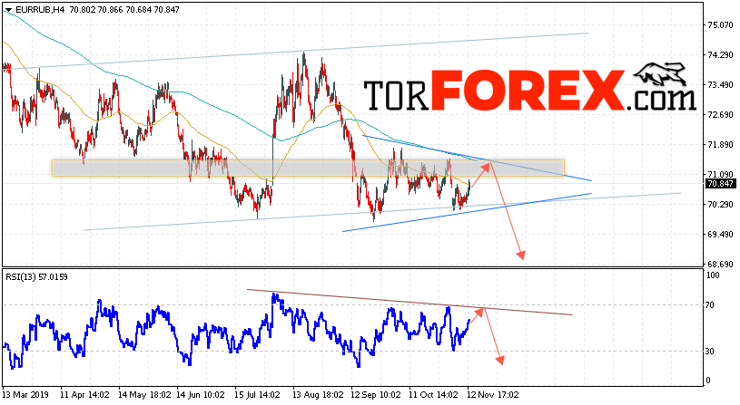 Дополнительным сигнальном в пользу падения валютной пары EUR/RUB на Форекс выступит тест нисходящей линии тренда на индикаторе относительной силы. Вторым сигналом в пользу падения курса станет отскок от верхней границы модели «Треугольник». Отменой варианта падения пары EUR/RUB на Форекс 14 ноября 2019 станет сильный рост и пробой уровня 72.15 Евро за Рубль. Это укажет на пробой области сопротивления и продолжение роста пары Евро Рубль в область выше уровня 74.95. Подтверждением падения валютной пары выступит пробой области поддержки и закрытие котировок инструмента под уровнем 69.35, что укажет на выход котировок за пределы модели «Треугольник».