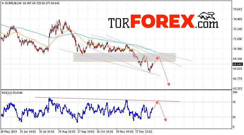 Дополнительным сигнальном в пользу снижения валютной пары EUR/RUB на Форекс выступит тест нисходящей линии тренда на индикаторе относительной силы. Вторым сигналом в пользу падения курса европейской валюты станет отскок от верхней границы нисходящего канала. Отменой варианта падения валютной пары EUR/RUB на Форекс 17 января 2020 станет сильный рост и пробой уровня 70.65 Евро за Рубль. Это укажет на пробой области сопротивления и продолжение роста пары Евро Рубль в область выше уровня 73.55. Подтверждением падения валютной пары выступит пробой области поддержки и закрытие котировок инструмента под уровнем 67.15.