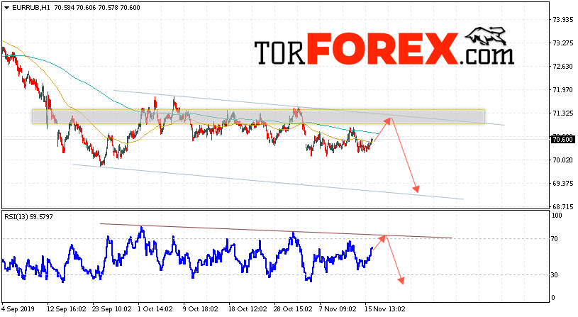 Дополнительным сигнальном в пользу падения валютной пары EUR/RUB на Форекс выступит тест нисходящей линии тренда на индикаторе относительной силы. Вторым сигналом в пользу падения курса станет отскок от верхней границы нисходящего канала. Отменой варианта падения пары EUR/RUB на Форекс 19 ноября 2019 станет сильный рост и пробой уровня 71.95 Евро за Рубль. Это укажет на пробой области сопротивления и продолжение роста пары Евро Рубль в область выше уровня 73.85. Подтверждением падения валютной пары выступит пробой области поддержки и закрытие котировок инструмента под уровнем 69.75.