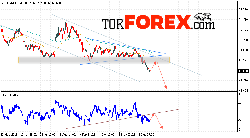Дополнительным сигнальном в пользу снижения валютной пары EUR/RUB на Форекс выступит тест нисходящей линии тренда на индикаторе относительной силы. Вторым сигналом в пользу падения курса европейской валюты станет отскок от верхней границы нисходящего канала. Отменой варианта падения валютной пары EUR/RUB на Форекс 26 декабря 2019 станет сильный рост и пробой уровня 71.25 Евро за Рубль. Это укажет на пробой области сопротивления и продолжение роста пары Евро Рубль в область выше уровня 73.25. Подтверждением падения валютной пары выступит пробой области поддержки и закрытие котировок инструмента под уровнем 68.05.