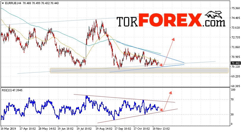 Дополнительным сигнальном в пользу подъёма валютной пары EUR/RUB на Форекс выступит тест восходящей линии тренда на индикаторе относительной силы. Вторым сигналом в пользу подъёма курса станет отскок от нижней границы модели «Треугольник». Отменой варианта роста валютной пары EUR/RUB на Форекс 27 ноября 2019 станет падение и пробой уровня 69.25 Евро за Рубль. Это укажет на пробой области поддержки и продолжение падения пары Евро Рубль в область ниже уровня 66.45. Подтверждением роста валютной пары выступит пробой верхней границы модели «Треугольник» и закрытие котировок инструмента над уровнем 71.45.