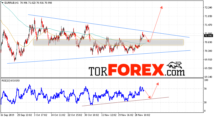 Дополнительным сигнальном в пользу подъёма валютной пары EUR/RUB на Форекс выступит тест пробитой линии тренда на индикаторе относительной силы. Вторым сигналом в пользу роста курса станет отскок от нижней границы модели «Треугольник». Отменой варианта роста валютной пары EUR/RUB на Форекс 4 декабря 2019 станет падение и пробой уровня 69.55 Евро за Рубль. Это укажет на пробой области поддержки и продолжение падения пары Евро Рубль в область ниже уровня 67.05. Подтверждением роста валютной пары выступит пробой верхней границы модели «Треугольник» и закрытие котировок инструмента над уровнем 71.55.