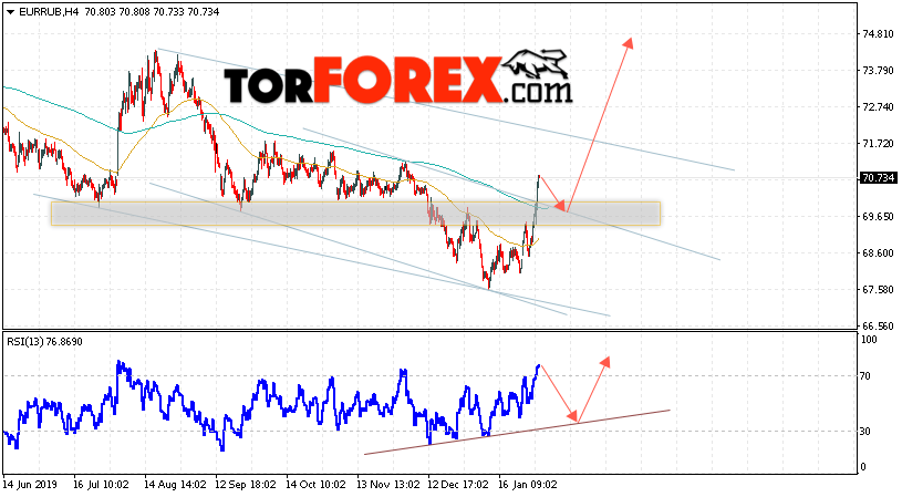 Дополнительным сигнальном в пользу подъёма валютной пары EUR/RUB на Форекс выступит тест восходящей линии тренда на индикаторе относительной силы. Вторым сигналом в пользу роста курса европейской валюты станет отскок от верхней границы нисходящего канала. Отменой варианта подъёма валютной пары EUR/RUB на Форекс 4 февраля 2020 станет падение и пробой уровня 68.95 Евро за Рубль. Это укажет на пробой области поддержки и продолжение падения пары Евро Рубль в область ниже уровня 66.25. Подтверждением роста валютной пары выступит пробой области сопротивления и закрытие котировок инструмента над уровнем 72.05.