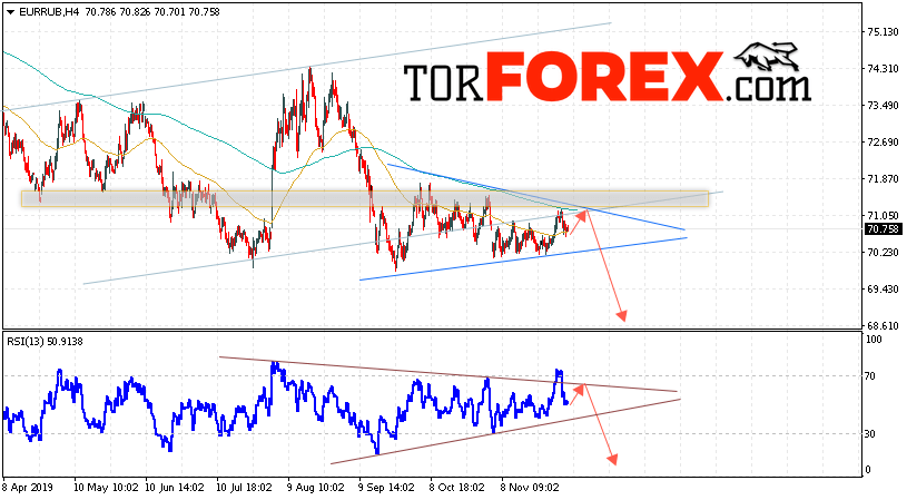 Дополнительным сигнальном в пользу снижения валютной пары EUR/RUB на Форекс выступит тест нисходящей линии тренда на индикаторе относительной силы. Вторым сигналом в пользу падения курса европейской валюты станет отскок от верхней границы модели «Треугольник». Отменой варианта падения валютной пары EUR/RUB на Форекс 6 декабря 2019 станет сильный рост и пробой уровня 71.95 Евро за Рубль. Это укажет на пробой области сопротивления и продолжение роста пары Евро Рубль в область выше уровня 74.25. Подтверждением падения валютной пары выступит пробой нижней границы модели «Треугольник» и закрытие котировок инструмента под уровнем 69.65.