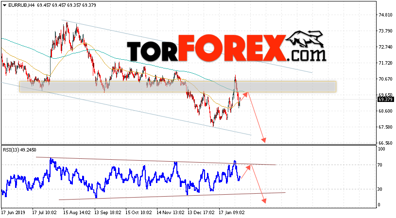 Дополнительным сигнальном в пользу снижения валютной пары EUR/RUB на Форекс выступит тест нисходящей линии тренда на индикаторе относительной силы. Вторым сигналом в пользу падения курса европейской валюты станет формирование разворотной модели «Голова и плечи». Отменой варианта снижения валютной пары EUR/RUB на Форекс 7 февраля 2020 станет сильный рост и пробой уровня 70.95 Евро за Рубль. Это укажет на пробой области сопротивления и продолжение роста пары Евро Рубль в область выше уровня 72.45. Подтверждением падения валютной пары выступит пробой области поддержки и закрытие котировок инструмента под уровнем 68.55.