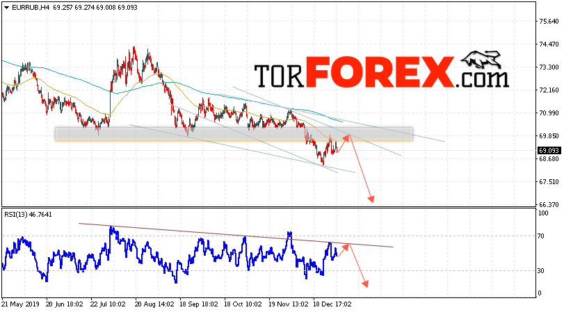 Дополнительным сигнальном в пользу снижения валютной пары EUR/RUB на Форекс выступит тест нисходящей линии тренда на индикаторе относительной силы. Вторым сигналом в пользу падения курса европейской валюты станет отскок от верхней границы нисходящего канала. Отменой варианта падения валютной пары EUR/RUB на Форекс 8 января 2020 станет сильный рост и пробой уровня 71.10 Евро за Рубль. Это укажет на пробой области сопротивления и продолжение роста пары Евро Рубль в область выше уровня 73.55. Подтверждением падения валютной пары выступит пробой области поддержки и закрытие котировок инструмента под уровнем 67.65.