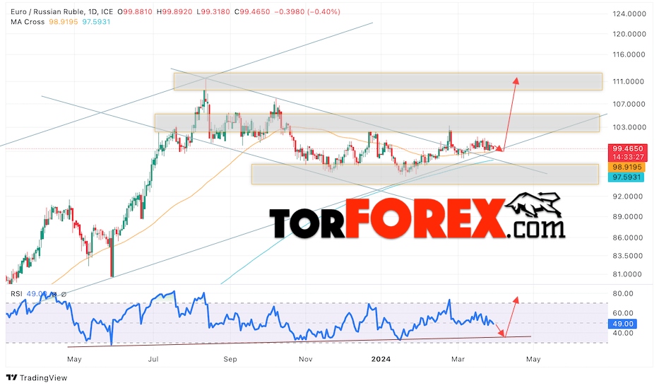 Дополнительным сигналом в пользу роста валютной пары EUR/RUB на текущей торговой неделе выступит отскок от нижней границы бычьего канала. Вторым сигналом станет отскок от линии поддержки на индикаторе относительной силы (RSI). Отменой варианта роста пары EUR/RUB на текущей торговой неделе 1 — 5 апреля 2024 станет падение и пробой уровня 96.75 Евро за Рубль. Это укажет на пробой области поддержки и продолжение падения пары Евро Рубль в область выше уровня 87.65. Подтверждением росту пары на текущей торговой неделе выступит пробой области сопротивления и закрытие котировок выше уровня 104.45.