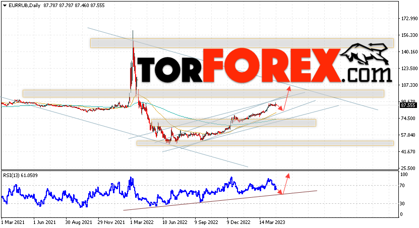 Дополнительным сигналом в пользу снижения валютной пары EUR/RUB на текущей торговой неделе выступит отскок от нижней границы бычьего канала. Вторым сигналом станет отскок от линии поддержки на индикаторе относительной силы (RSI). Отменой варианта роста пары EUR/RUB на текущей торговой неделе 1 — 5 мая 2023 станет падение и пробой уровня 74.35 Евро за Рубль. Это укажет на пробой области поддержки и продолжение падения пары Евро Рубль в область ниже уровня 67.85. Подтверждением росту пары на текущей торговой неделе выступит пробой области сопротивления и закрытие котировок выше уровня 92.55.