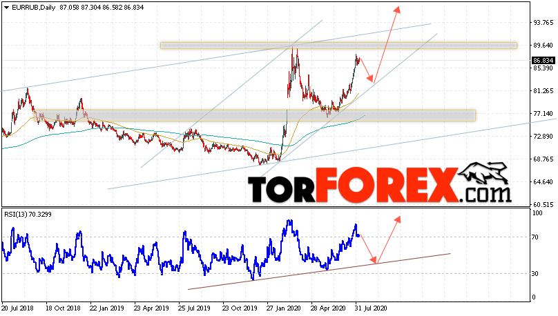 Валютная пара Евро Рубль EUR/RUB завершает торговую неделю вблизи области 86.83 и продолжает движение в рамках сильного роста и восходящего канала. Скользящие средние указывают на наличие бычьей тенденции по паре. Цены ушли вверх от области между сигнальными линиями, что указывает на давление со стороны покупателей европейской валюты и потенциальное продолжение роста уже с текущих уровней. В рамках прогноза курса Евро к Рублю на текущую неделю 10 — 14 августа 2020 стоит ожидать попытку продолжения развития нисходящей коррекции и тест уровня поддержки вблизи области 82.25 Рублей за Евро. Затем, отскок и продолжение роста валютной пары в область выше уровня 97.75.