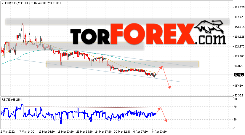 Дополнительным сигналом в пользу падения валютной пары EUR/RUB на текущей торговой неделе выступит отскок от верхней границы бычьего канала. Вторым сигналом станет отскок от линии сопротивления на индикаторе относительной силы. Отменой варианта падения пары EUR/RUB на текущей торговой неделе 11 — 15 апреля 2022 станет сильный рост и пробой уровня 110.65 Евро за Рубль. Это укажет на пробой области сопротивления и продолжение роста пары Евро Рубль в область выше уровня 120.05. Подтверждением падению пары на текущей торговой неделе выступит пробой области поддержки и закрытие котировок ниже уровня 76.05, что укажет на пробой нижней границы нисходящего канала.