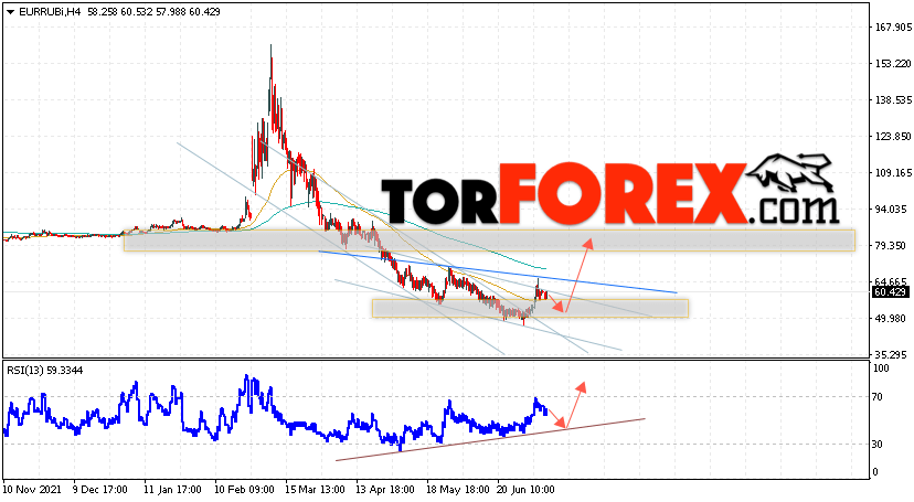 Дополнительным сигналом в пользу роста валютной пары EUR/RUB на текущей торговой неделе выступит отскок от нижней границы разворотной модели ”Голова и плечи”. Вторым сигналом станет отскок от линии поддержки на индикаторе относительной силы. Отменой варианта роста пары EUR/RUB на текущей торговой неделе 11 — 15 июля 2022 станет падение и пробой уровня 44.55 Евро за Рубль. Это укажет на пробой области поддержки и продолжение падения пары Евро Рубль в область ниже уровня 35.05. Подтверждением росту пары на текущей торговой неделе выступит пробой области сопротивления и закрытие котировок выше уровня 67.05, что укажет на пробой верхней границы разворотной модели ”Голова и плечи”.
