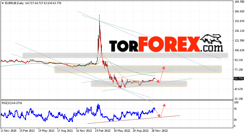 Дополнительным сигналом в пользу роста валютной пары EUR/RUB на текущей торговой неделе выступит отскок от нижней границы бычьего канала. Вторым сигналом станет отскок от бычьей линии тренда на индикаторе относительной силы. Отменой варианта роста пары EUR/RUB на текущей торговой неделе 12 — 16 декабря 2022 станет падение и пробой уровня 48.45 Евро за Рубль. Это укажет на пробой области поддержки и продолжение падения пары Евро Рубль в область ниже уровня 42.65. Подтверждением росту пары на текущей торговой неделе выступит пробой области сопротивления и закрытие котировок выше уровня 78.55, что укажет на пробой верхней границы бычьего канала.