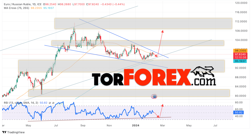 Дополнительным сигналом в пользу роста валютной пары EUR/RUB на текущей торговой неделе выступит отскок от нижней границы бычьего канала. Вторым сигналом станет отскок от линии поддержки на индикаторе относительной силы (RSI). Отменой варианта роста пары EUR/RUB на текущей торговой неделе 12 — 16 февраля 2024 станет падение и пробой уровня 93.05 Евро за Рубль. Это укажет на пробой области поддержки и продолжение падения пары Евро Рубль в область выше уровня 86.55. Подтверждением росту пары на текущей торговой неделе выступит пробой области сопротивления и закрытие котировок выше уровня 101.55, что укажет на пробой верхней границы разворотной модели «Клин» и начало отработки паттерна с целями вверху.