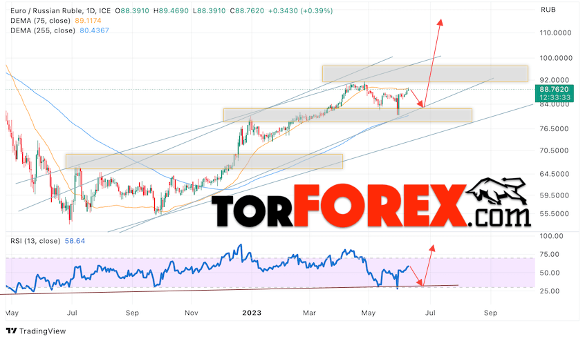 Дополнительным сигналом в пользу роста валютной пары EUR/RUB на текущей торговой неделе выступит отскок от нижней границы бычьего канала. Вторым сигналом станет отскок от линии поддержки на индикаторе относительной силы (RSI). Отменой варианта роста пары EUR/RUB на текущей торговой неделе 12 — 16 июня 2023 станет падение и пробой уровня 76.05 Евро за Рубль. Это укажет на пробой области поддержки и продолжение падения пары Евро Рубль в область ниже уровня 67.05. Подтверждением росту пары на текущей торговой неделе выступит пробой области сопротивления и закрытие котировок выше уровня 92.35.