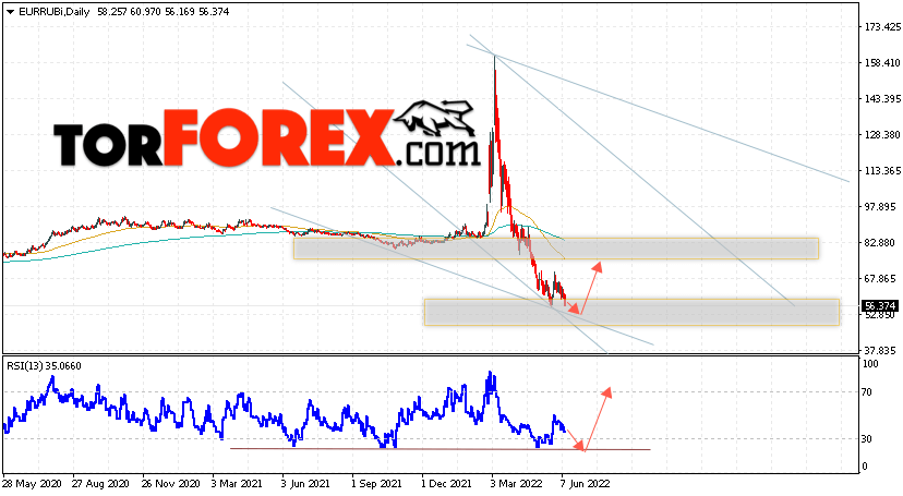 Дополнительным сигналом в пользу роста валютной пары EUR/RUB на текущей торговой неделе выступит отскок от нижней границы нисходящего канала. Вторым сигналом станет отскок от линии поддержки на индикаторе относительной силы. Отменой варианта роста пары EUR/RUB на текущей торговой неделе 13 — 17 июня 2022 станет падение и пробой уровня 47.05 Евро за Рубль. Это укажет на пробой области поддержки и продолжение падения пары Евро Рубль в область ниже уровня 35.05. Подтверждением росту пары на текущей торговой неделе выступит пробой области сопротивления и закрытие котировок выше уровня 69.05.