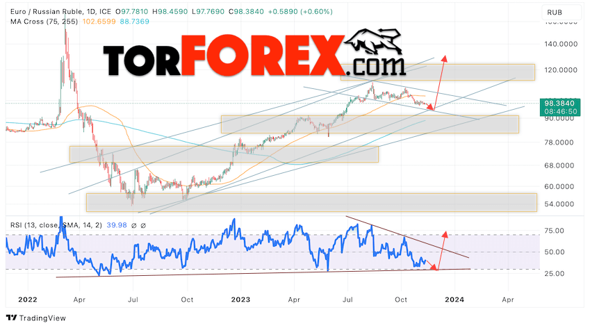 Дополнительным сигналом в пользу роста валютной пары EUR/RUB на текущей торговой неделе выступит отскок от нижней границы бычьего канала. Вторым сигналом станет отскок от линии поддержки на индикаторе относительной силы (RSI). Отменой варианта роста пары EUR/RUB на текущей торговой неделе 13 — 17 ноября 2023 станет падение и пробой уровня 87.05 Евро за Рубль. Это укажет на пробой области поддержки и продолжение падения пары Евро Рубль в область ниже уровня 84.65. Подтверждением росту пары на текущей торговой неделе выступит пробой области сопротивления и закрытие котировок выше уровня 103.85, что укажет на пробой верхней границы медвежьего канала коррекции.