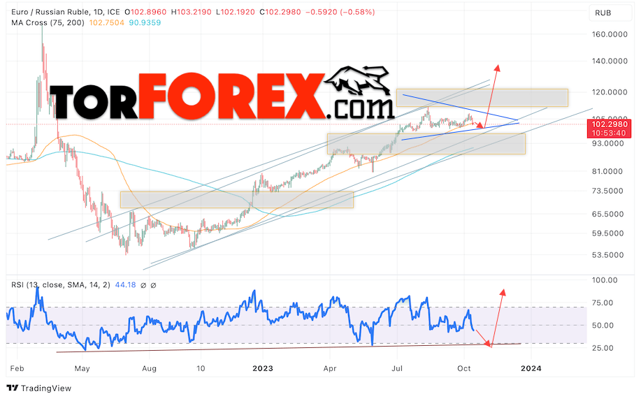 Дополнительным сигналом в пользу роста валютной пары EUR/RUB на текущей торговой неделе выступит отскок от нижней границы модели «Треугольник». Вторым сигналом станет отскок от линии поддержки на индикаторе относительной силы (RSI). Отменой варианта роста пары EUR/RUB на текущей торговой неделе 16 — 20 октября 2023 станет падение и пробой уровня 94.55 Евро за Рубль. Это укажет на пробой области поддержки и продолжение падения пары Евро Рубль в область ниже уровня 86.55. Подтверждением росту пары на текущей торговой неделе выступит пробой области сопротивления и закрытие котировок выше уровня 107.05, что укажет на пробой верхней границы модели «Треугольник» и начало отработки паттерна с целями вверху.