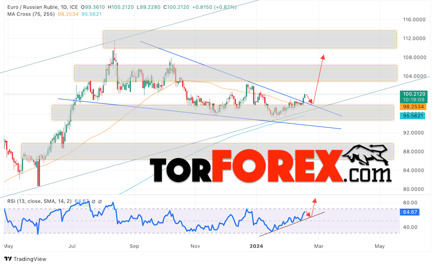 Дополнительным сигналом в пользу роста валютной пары EUR/RUB на текущей торговой неделе выступит отскок от верхней границы модели «Треугольник». Вторым сигналом станет отскок от линии поддержки на индикаторе относительной силы (RSI). Отменой варианта роста пары EUR/RUB на текущей торговой неделе 19 — 23 февраля 2024 станет падение и пробой уровня 92.25 Евро за Рубль. Это укажет на пробой области поддержки и продолжение падения пары Евро Рубль в область выше уровня 86.05. Подтверждением росту пары на текущей торговой неделе выступит пробой области сопротивления и закрытие котировок выше уровня 102.05.