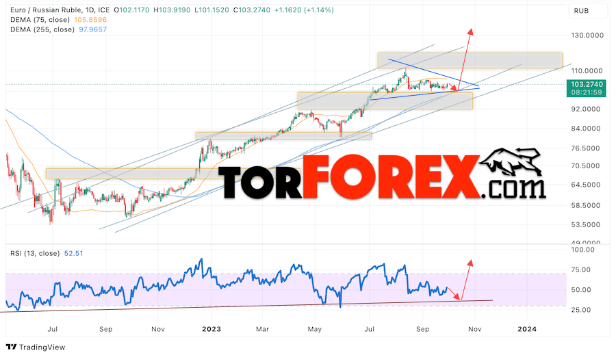 Дополнительным сигналом в пользу роста валютной пары EUR/RUB на текущей торговой неделе выступит отскок от нижней границы модели «Треугольник». Вторым сигналом станет отскок от линии поддержки на индикаторе относительной силы (RSI). Отменой варианта роста пары EUR/RUB на текущей торговой неделе 2 — 6 октября 2023 станет падение и пробой уровня 93.05 Евро за Рубль. Это укажет на пробой области поддержки и продолжение падения пары Евро Рубль в область ниже уровня 85.65. Подтверждением росту пары на текущей торговой неделе выступит пробой области сопротивления и закрытие котировок выше уровня 107.05, что укажет на пробой верхней границы модели «Треугольник» и начало отработки паттерна с целями вверху.
