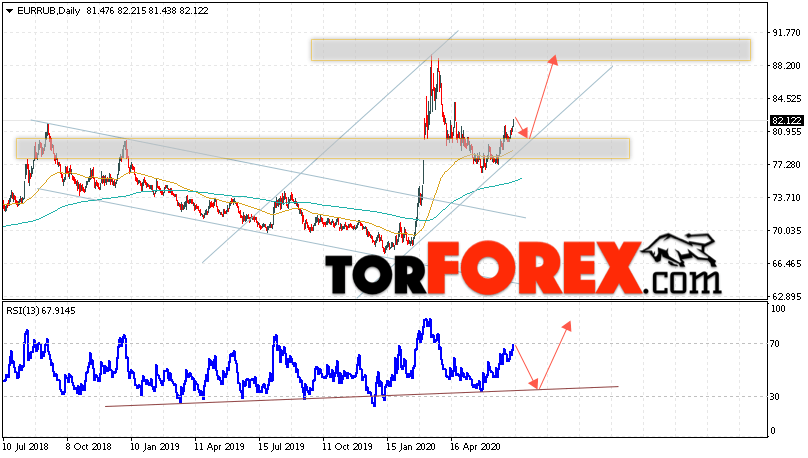 Валютная пара Евро Рубль EUR/RUB завершает торговую неделю вблизи области 82.12 и продолжает движение в рамках роста и восходящего канала. Скользящие средние указывают на наличие бычьей тенденции по паре. Цены успешно оттолкнулись от области между сигнальными линиями, что указывает на давление со стороны покупателей европейской валюты и потенциальное продолжение роста уже с текущих уровней. В рамках прогноза курса Евро к Рублю на текущую неделю 20 — 24 июля 2020 стоит ожидать попытку продолжения развития нисходящей коррекции и тест уровня поддержки вблизи области 80.75 Рублей за Евро. Затем, отскок и продолжение роста валютной пары в область выше уровня 89.55.