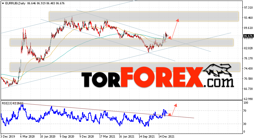 Дополнительным сигналом в пользу роста валютной пары EUR/RUB на текущей торговой неделе выступит отскок от верхней границы нисходящего канала. Вторым сигналом станет отскок от линии тренда на индикаторе относительной силы, которая была пробита покупателям вверх. Отменой варианта роста пары EUR/RUB на текущей торговой неделе 24 — 28 января 2022 станет падение цен и пробой уровня 83.05 Евро за Рубль. Это укажет на пробой области поддержки и продолжение падения пары Евро Рубль в область ниже уровня 76.05, также будет потенциал для формирования разворотной модели ”Голова и плечи” в пользу сильного падения валютной пары. Подтверждением подъёму пары на текущей торговой неделе выступит пробой области сопротивления и закрытие котировок выше уровня 89.65.
