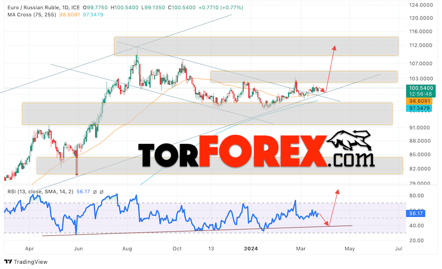 Дополнительным сигналом в пользу роста валютной пары EUR/RUB на текущей торговой неделе выступит отскок от нижней границы бычьего канала. Вторым сигналом станет отскок от линии поддержки на индикаторе относительной силы (RSI). Отменой варианта роста пары EUR/RUB на текущей торговой неделе 25 — 29 марта 2024 станет падение и пробой уровня 96.05 Евро за Рубль. Это укажет на пробой области поддержки и продолжение падения пары Евро Рубль в область выше уровня 87.45. Подтверждением росту пары на текущей торговой неделе выступит пробой области сопротивления и закрытие котировок выше уровня 104.25.